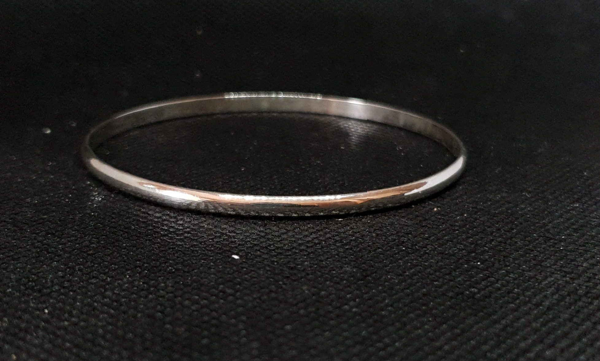 A solid, handmade 3mm half round bangle in sterling silver, 64mm inside diameter. Perfect to fit multiple on your arm.